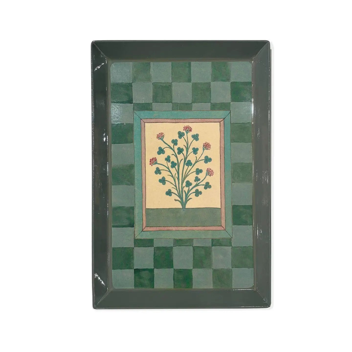 Add a touch of vintage charm to your home with this Book of Herbs Green Check Rectangular Enamel Tray. Expertly handcrafted in India, each tray is unique, with variations in the final product due to the handmade process. This decorative tray features an enchanting herb illustration, handpicked from a German Book of Herbs first published in 1462, which has been paired with a contemporary green check pattern, painted in delicate watercolour.